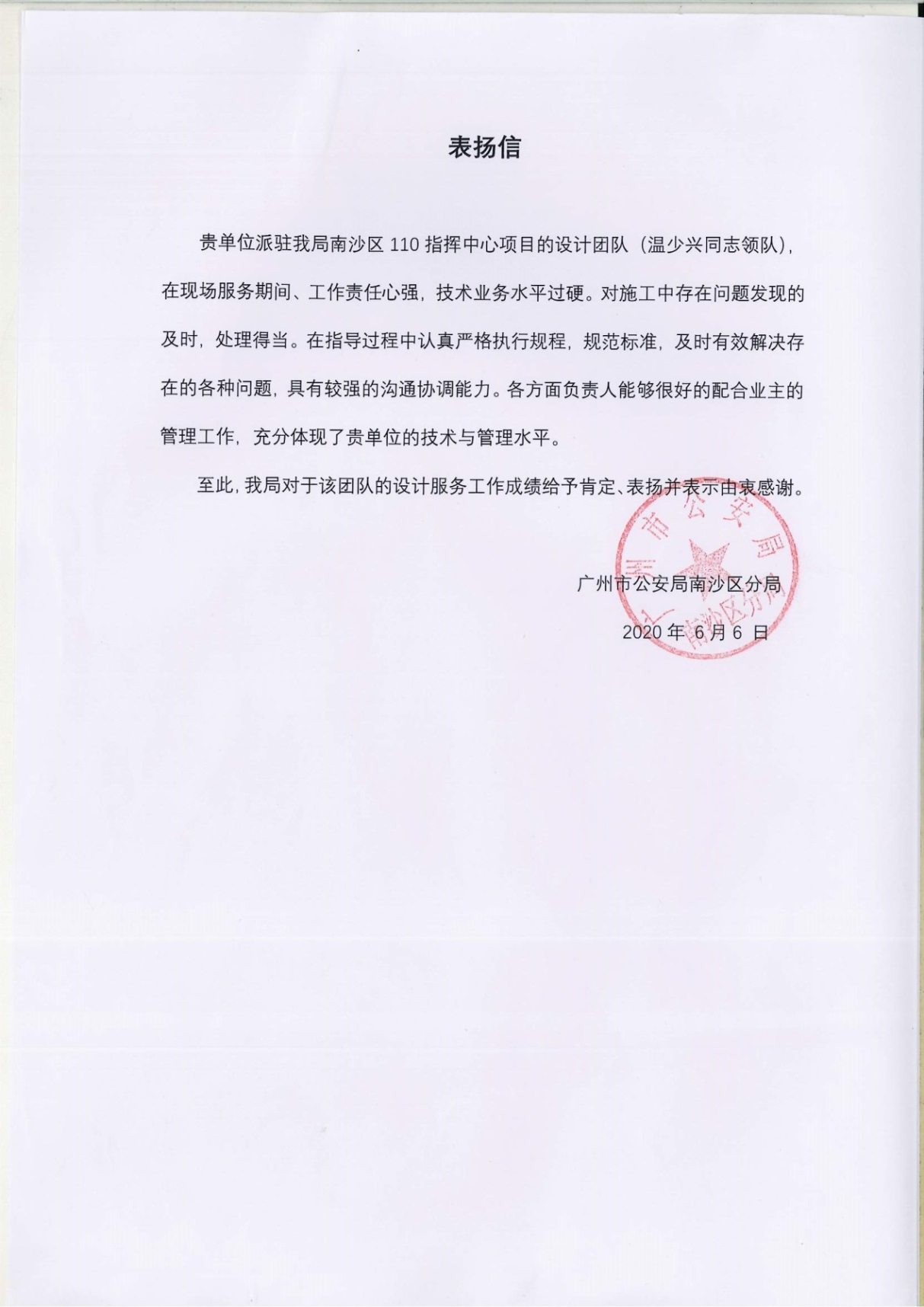 近日,廣州市公安局南沙區分局送來表揚信,對我公司廣州市南沙公安分局110指揮中心裝修設計工程的設計團隊給予表揚。