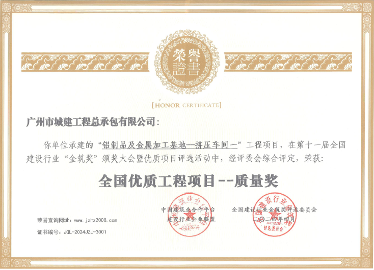 4月,公司積極參加全國建設行業“金筑獎”評選活動,經綜合評定,由公司承建的新興鳳鋁公司鋁制品及金屬加工基地--擠壓車間一工程項目榮獲第十一屆“金筑獎”全國優質工程項目——質量獎。