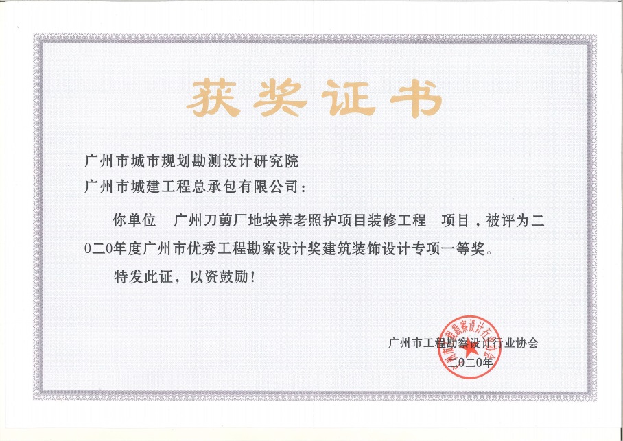 公司廣州刀剪廠地塊養(yǎng)老照護項目裝修分部分項工程在廣州市2020年度優(yōu)秀工程勘察設(shè)計獎評選中獲建筑裝飾設(shè)計專項一等獎。主要設(shè)計人員包括:江永耀、袁學(xué)松、錢萍、陳麗牡、陳建拓、崔衛(wèi)琪、盧穎欣、朱鳳樁。 ...